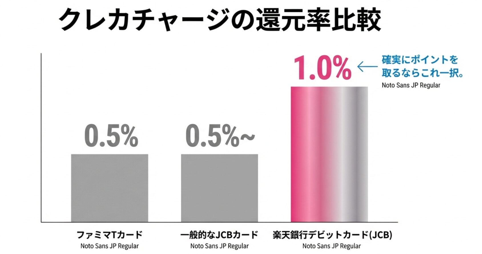 - チャージ: 「楽天銀行デビットカード(JCB)」からファミペイへチャージ(1%還元)。