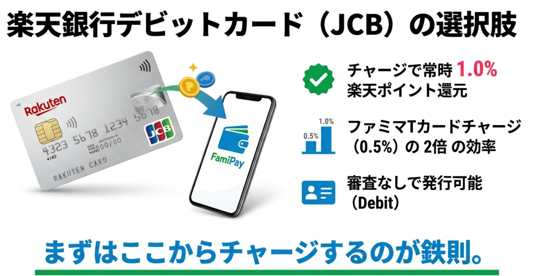 現在、ファミペイへのチャージで効率よくポイントを貯められるのが「楽天銀行デビットカード(JCBブランド)」です。