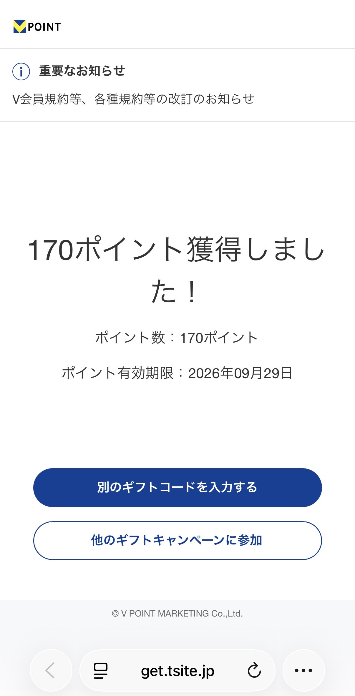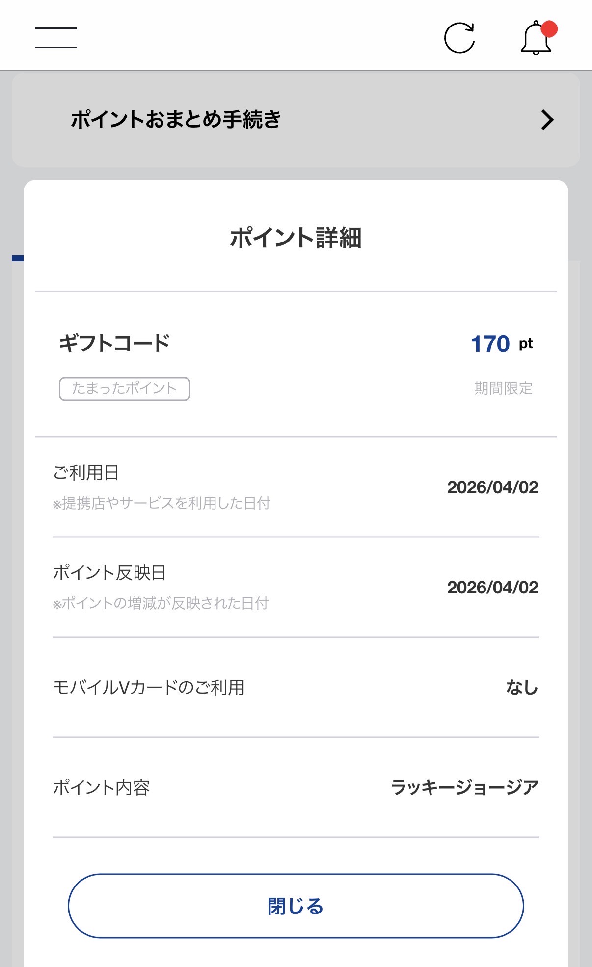 Vポイントアプリ上でもポイント付与されていることが確認できました!