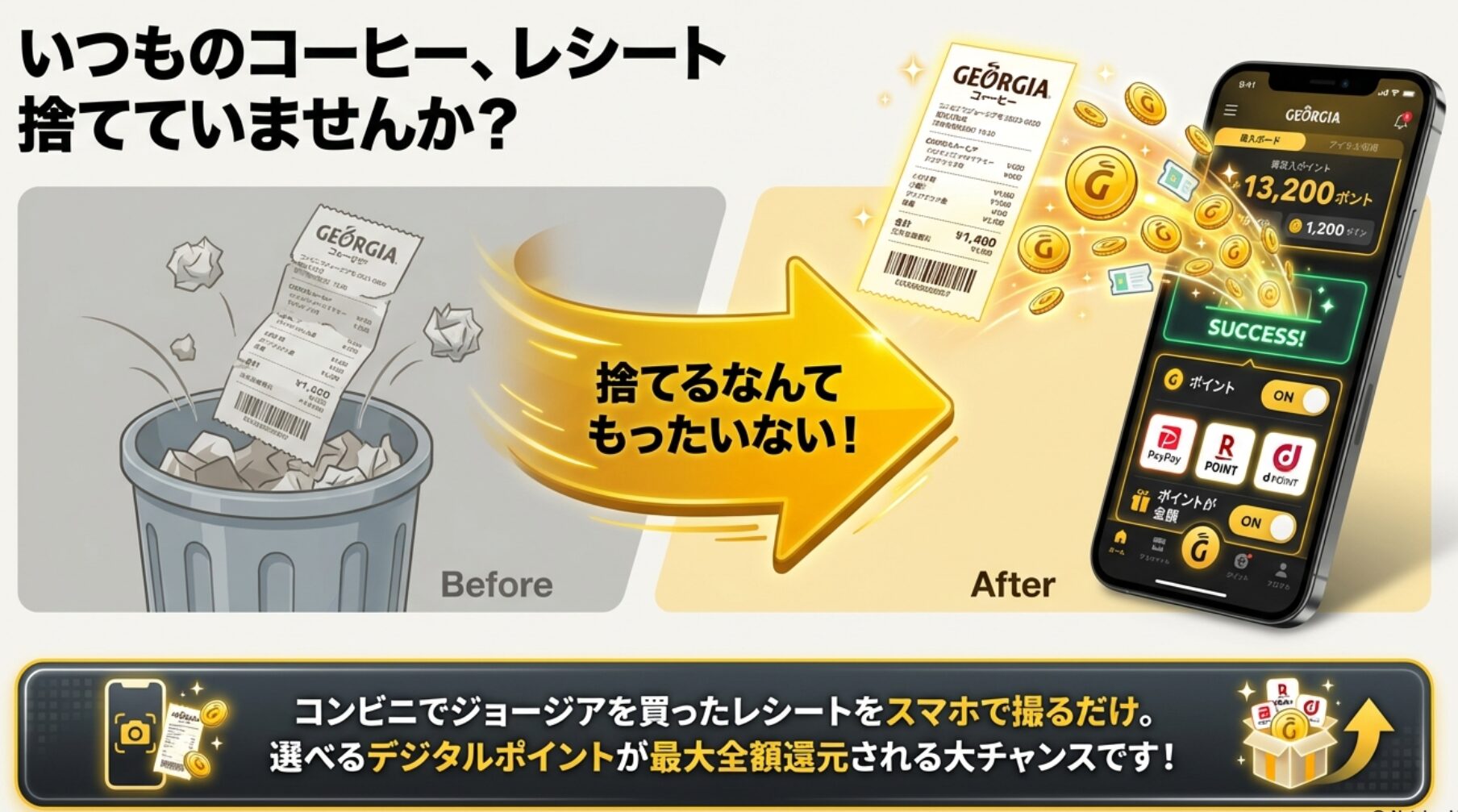現在開催中の「ラッキージョージア」キャンペーンなら、コンビニで購入したレシートをアップロードするだけで、PayPayや楽天ポイントなどの選べるデジタルポイントが最大全額還元されるチャンスがあります。