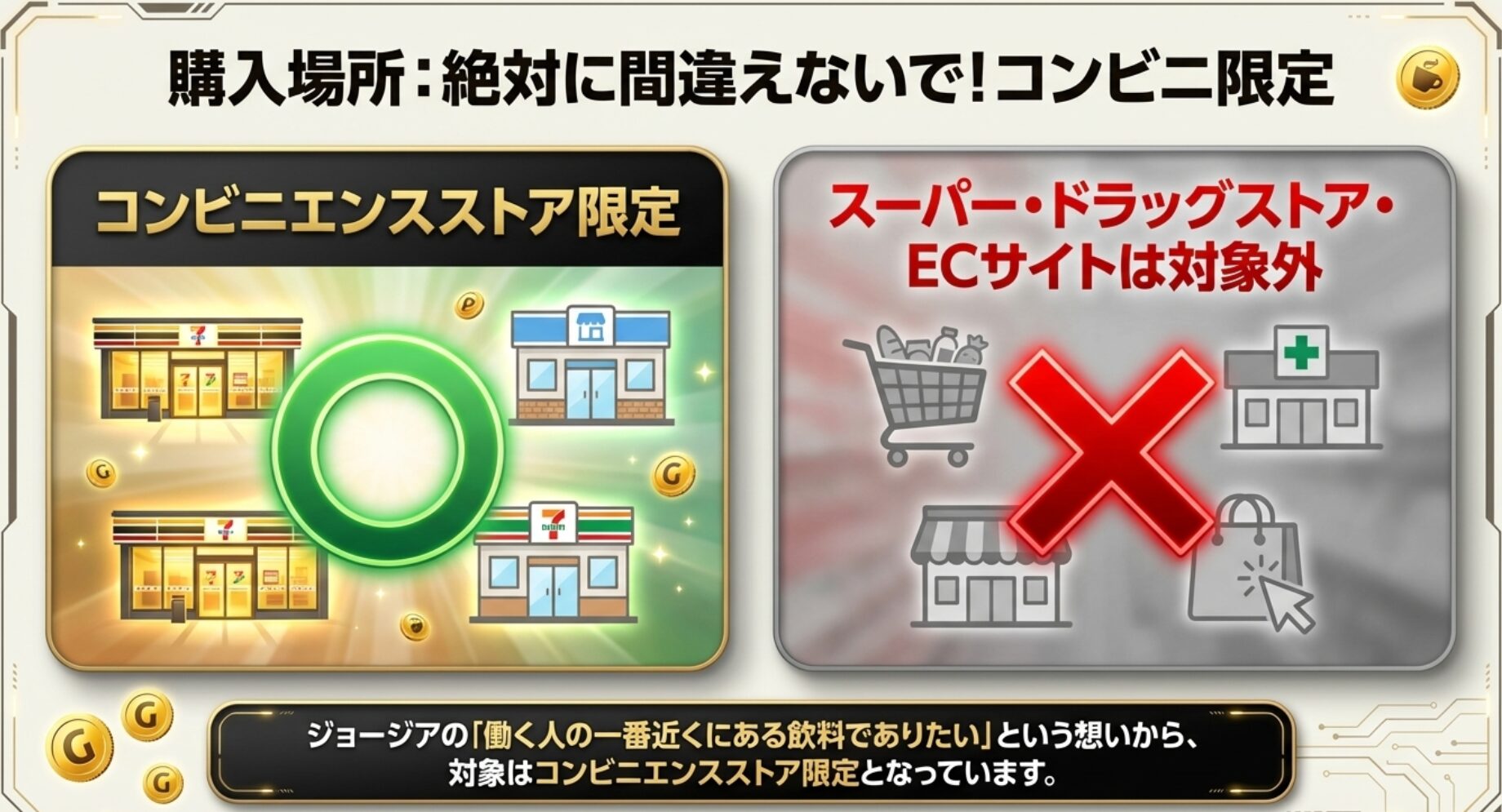ラッキージョージア」の大きな特徴は、「コンビニエンスストア」での購入がメインの対象となっている点です。