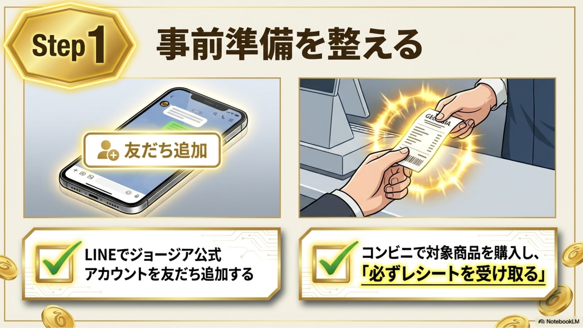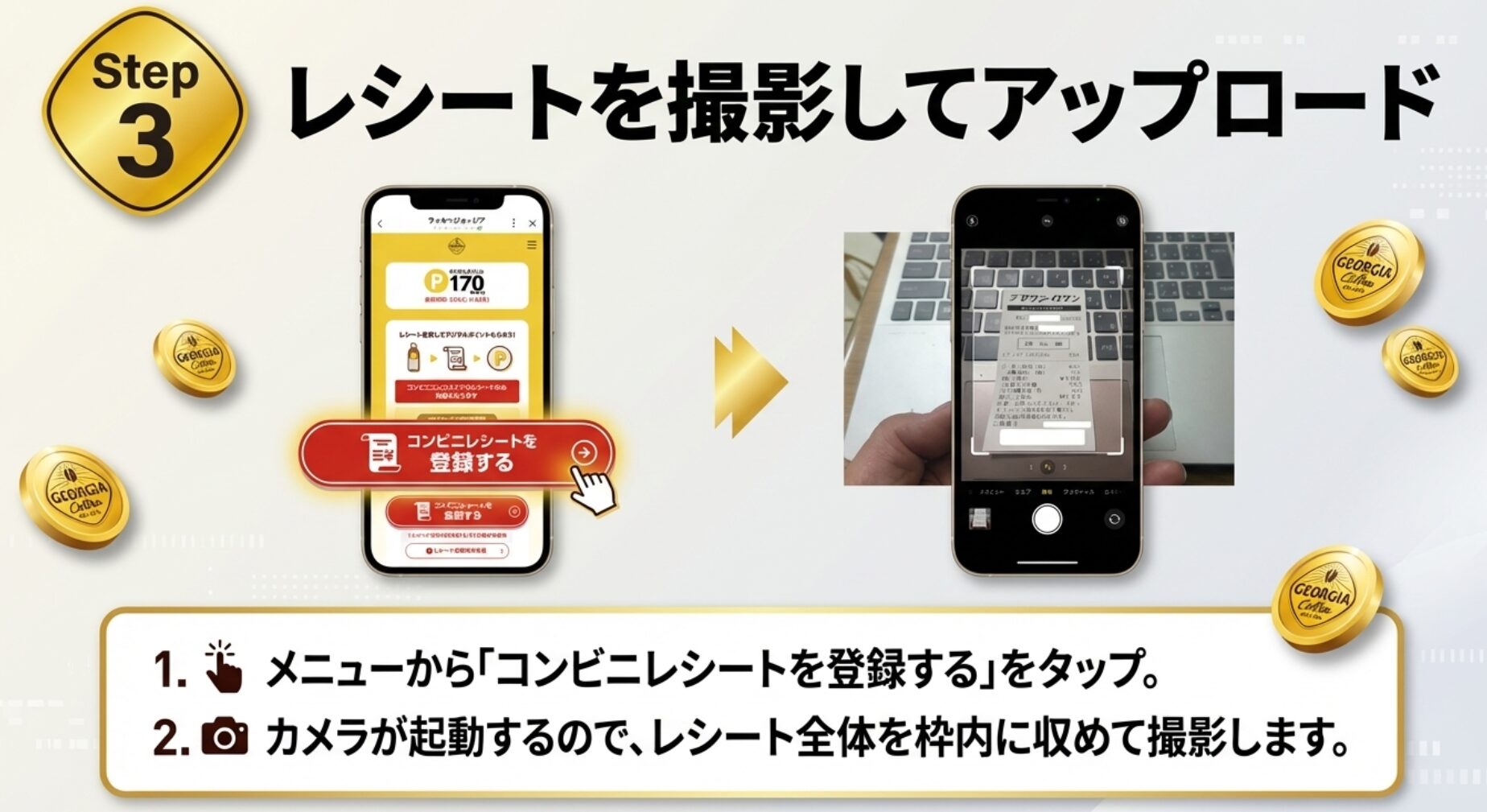 コンビニで対象のジョージア製品を購入。「レシート」を必ず受け取りましょう。