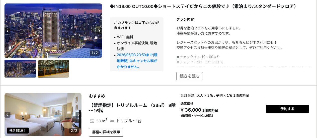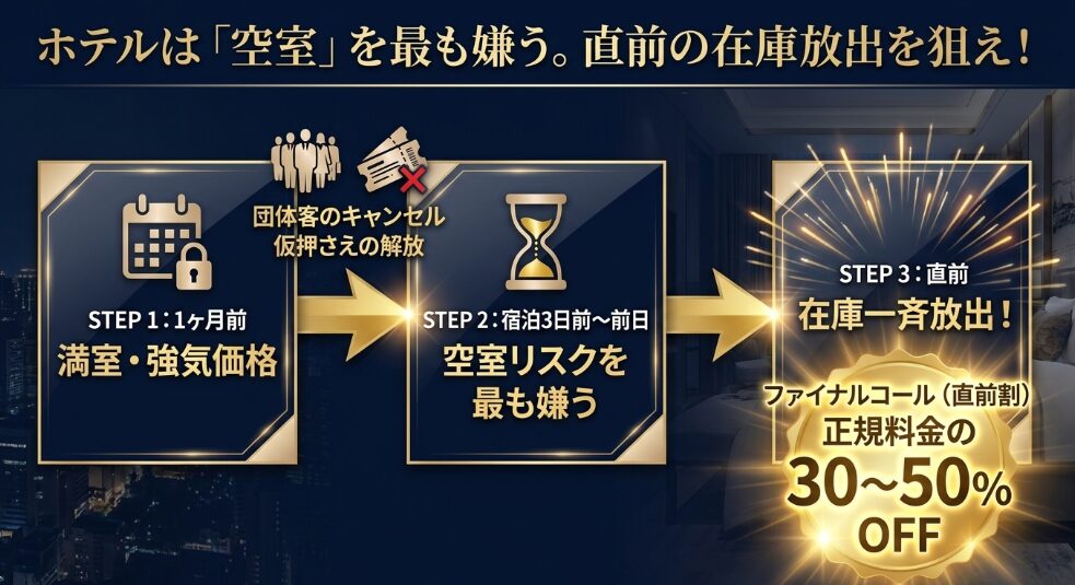 ホテルは空室を出すことを最も嫌います。宿泊日の3日前〜前日にかけて、団体客のキャンセルや仮押さえの解放が行われることがあります。