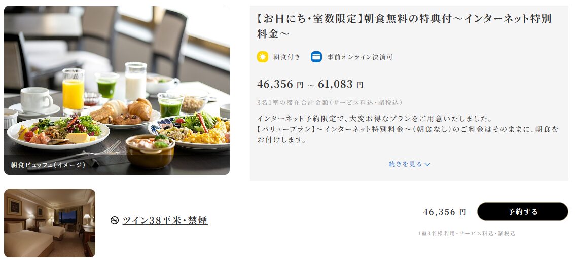 ちなみに我が家は先日(このブログを書いている2,3日前になりますが)、インターネット限定プランで1万円以上安く都内の高級ホテルに宿泊予約しました!