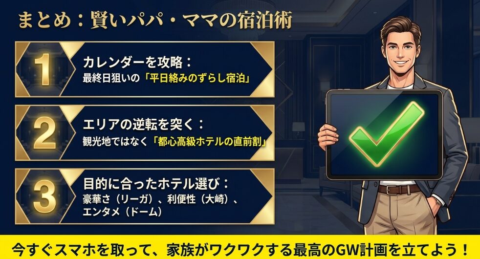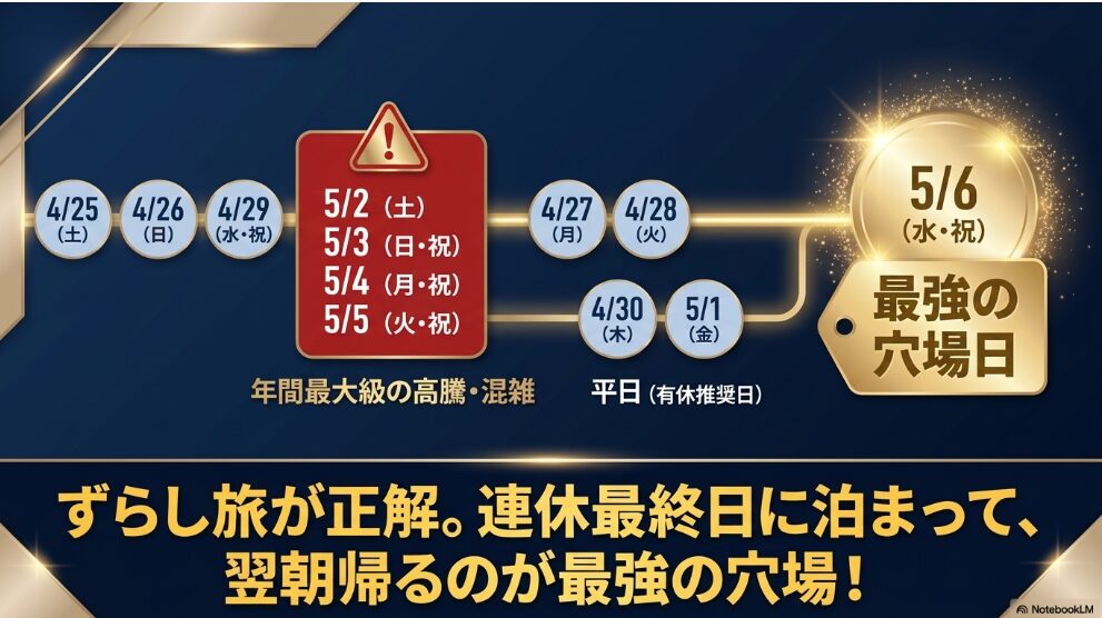 2026年のゴールデンウィークは、日並びを味方につけた「平日絡みのずらし宿泊」と「都心高級ホテルの直前割」が成功の鍵です。