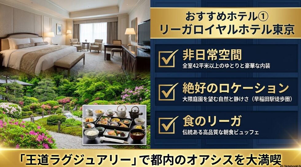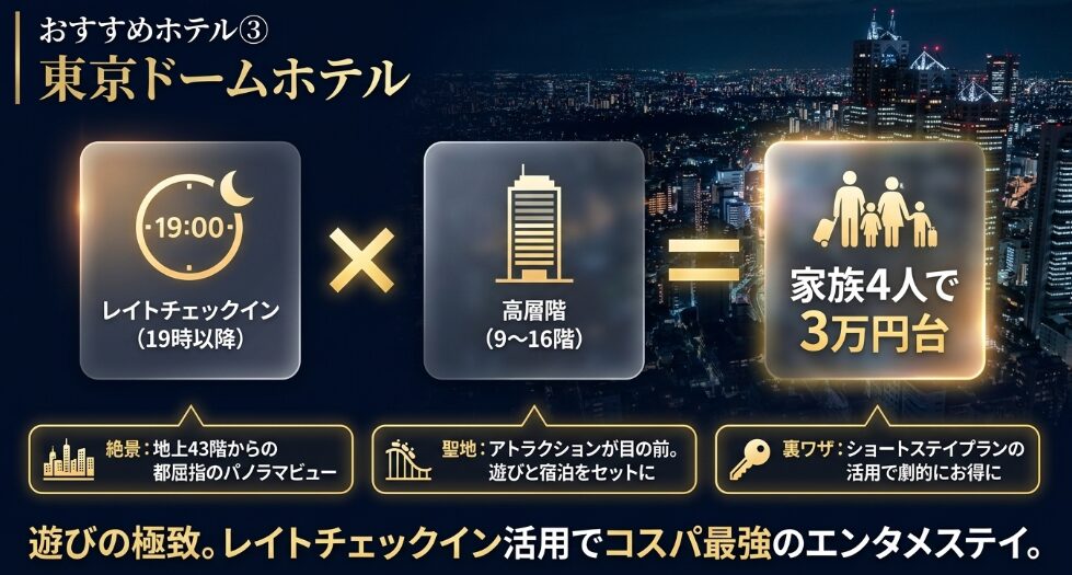 リーガロイヤルホテル東京で王道ラグジュアリーを、ホテルオータニイン東京で最強の利便性を、東京ドームホテルで遊びの極致を。それぞれのホテルの特長を理解し、自分の家族にぴったりのプランを選んでください。