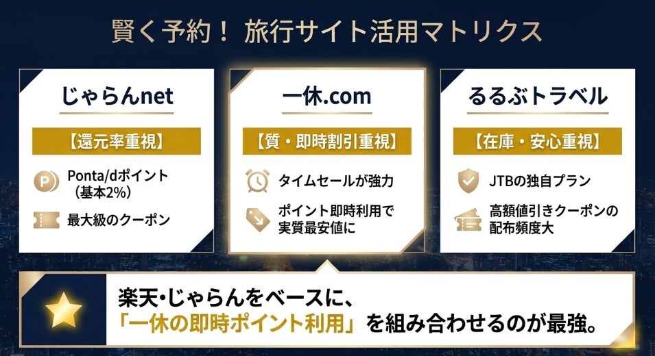 予約サイトは、楽天・じゃらんの2強をベースに、一休の即時ポイント利用を組み合わせるのが最も効率的です。また、首都圏にお住まいの方はディズニーの平日割引パスポートも忘れずにチェックを!