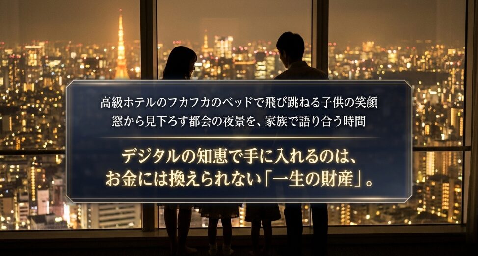 高級ホテルのフカフカのベッドで飛び跳ねる子供の笑顔や、窓から見える都会の夜景を家族で眺める時間は、お金には換えられない一生の財産になります。