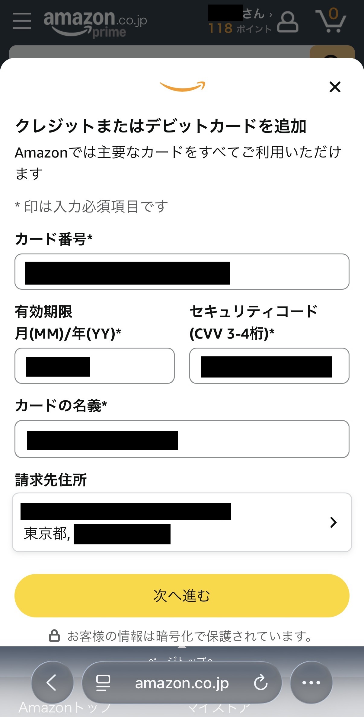 カード番号、有効期限、セキュリティコード、カード名義等を入力して登録は完了です。