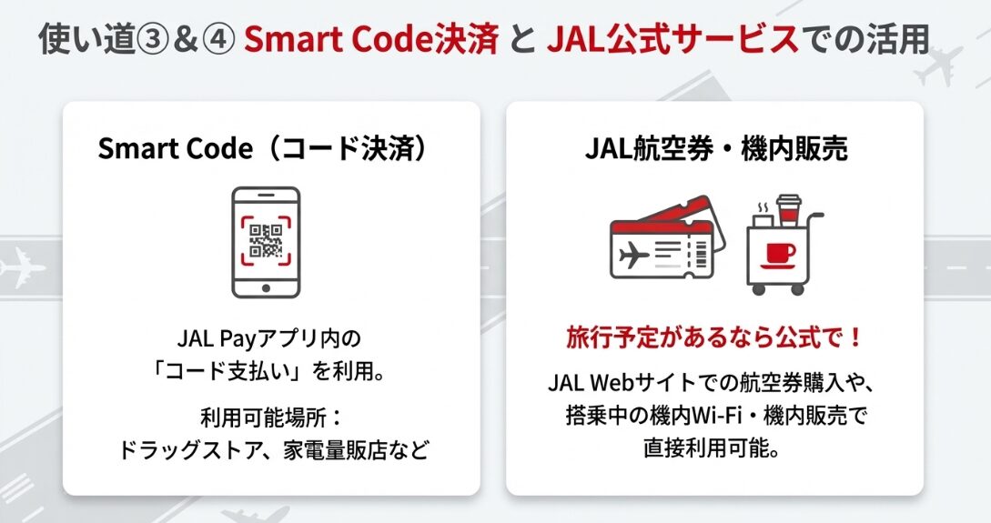 旅行の予定があるなら、JAL公式サイトでの航空券購入や、搭乗中の機内販売で利用するのもお得です。