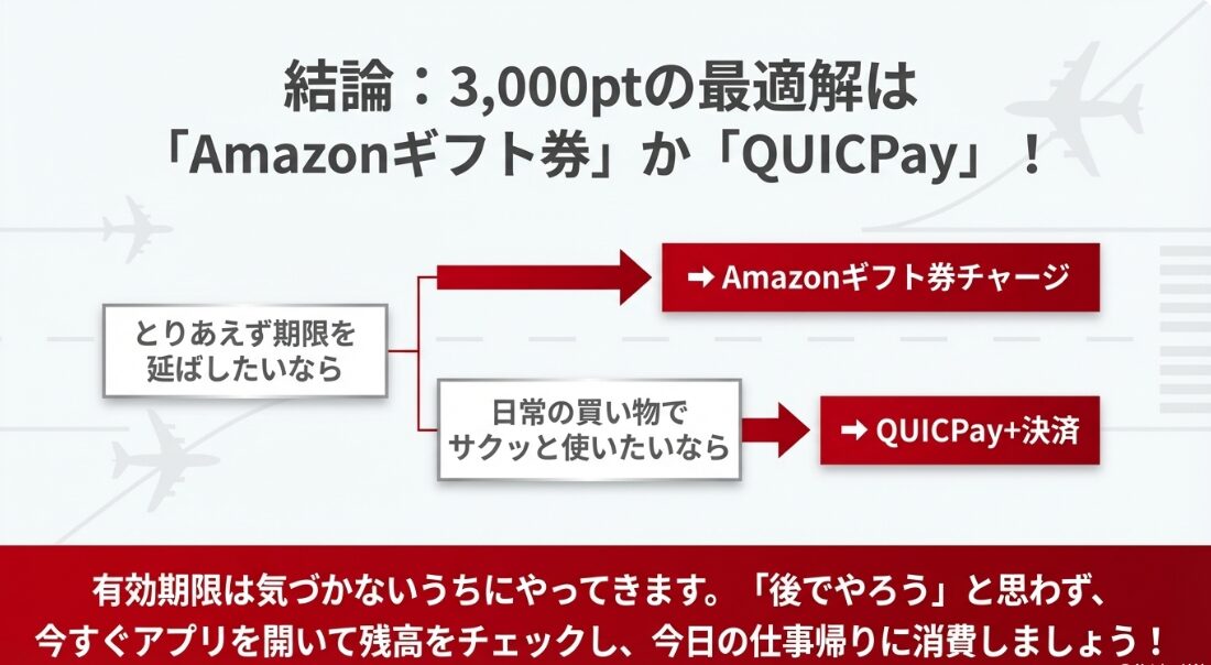 まとめ:3,000ptは「Amazonギフト券」か「QUICPay」が正解!