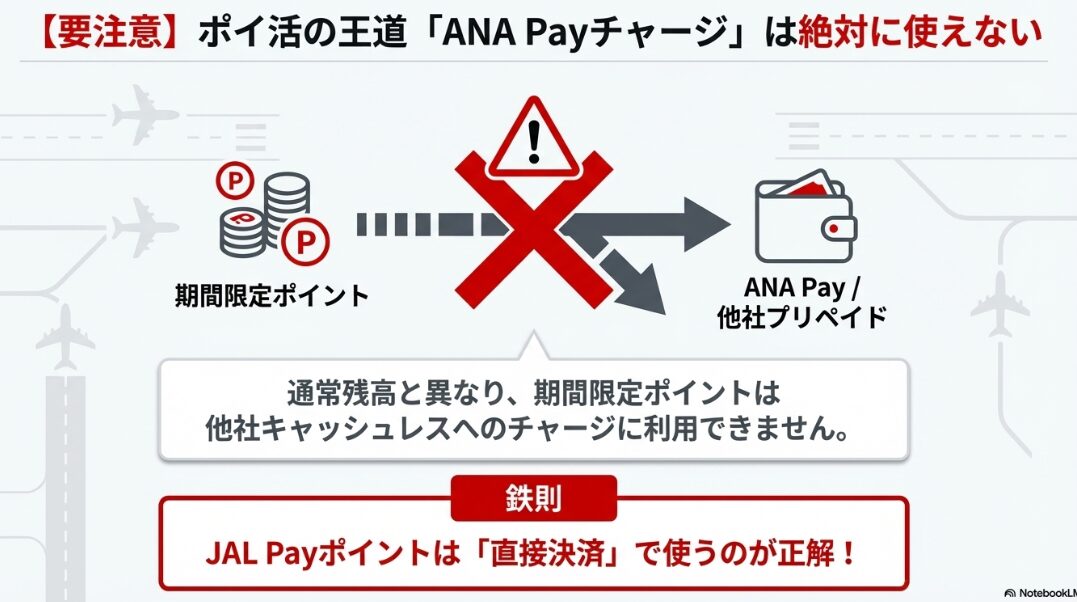 JAL Payの残高をANA Payへチャージして、さらに他のキャッシュレス決済へ回すルート(いわゆるポイ活ルート)は有名ですが、「期間限定ポイント」はこのチャージに利用することができません。