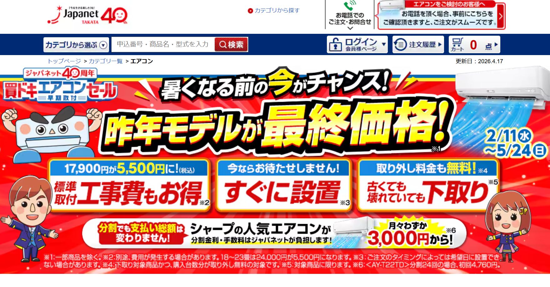 ジャパネットたかたでは、例年エアコンの需要が高まる前の時期に「エアコン早期取付キャンペーン」や「エアコン祭り」といった大型セールを開催しています。