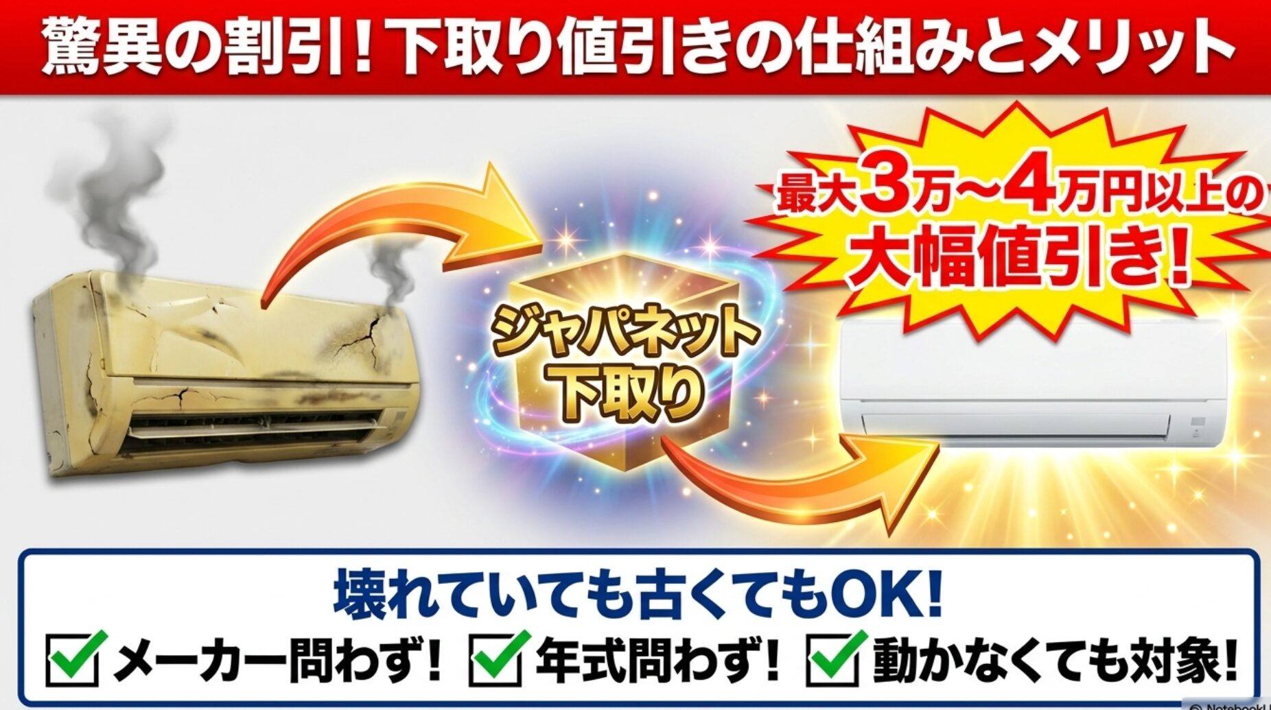 ジャパネットの最大の特徴は、古いエアコンを「下取り」に出すことで、販売価格から直接値引きが受けられる点です。