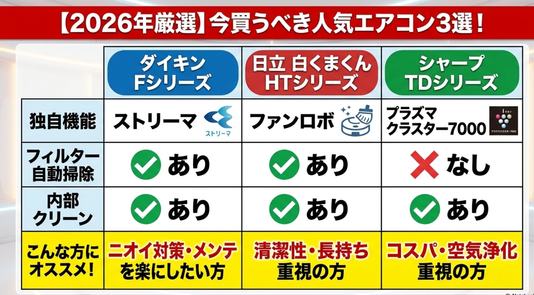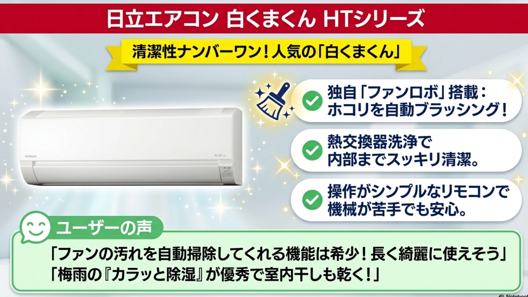 • ファンの汚れを自動で掃除してくれる機能は他社には少なく、長く綺麗に使えそうです。