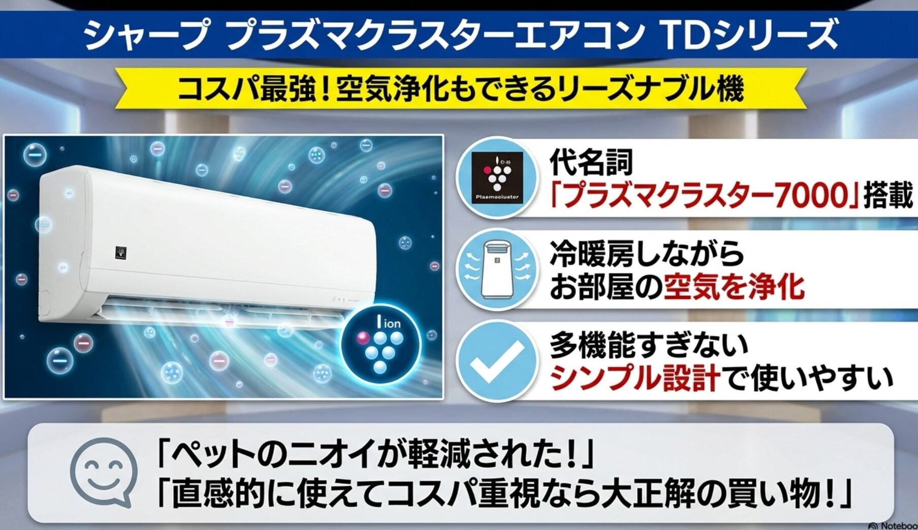 • プラズマクラスターのおかげか、ペットを飼っている部屋の特有のニオイが軽減された気がします。