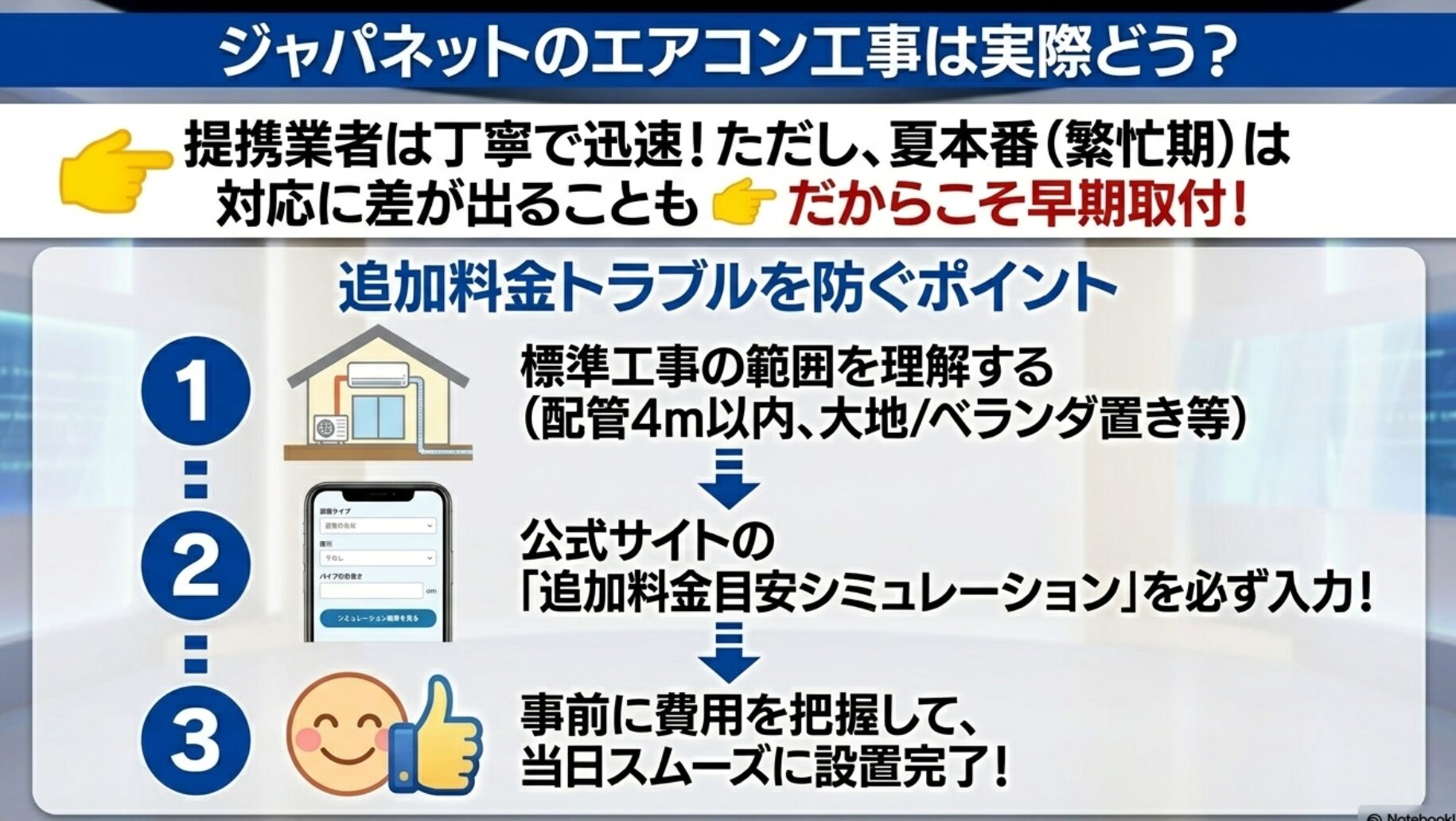 工事に関しても、事前に公式サイトのシミュレーションを活用し、標準工事の範囲を把握しておくことで、当日慌てることなくスムーズに設置を完了させることができます。