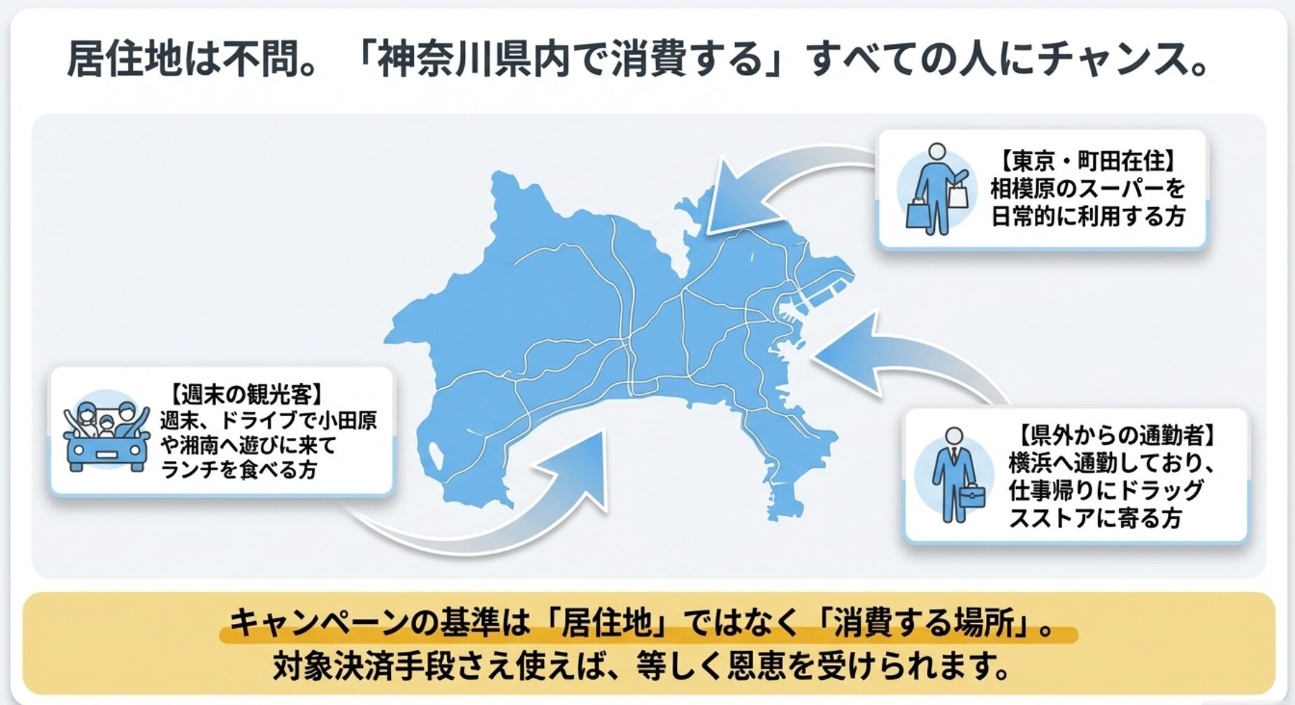 多くの方が気になる「神奈川県民以外は使えるの?」という疑問。結論から言うと、県外居住者でも、神奈川県内の対象店舗でお買い物をする人なら利用可能です!