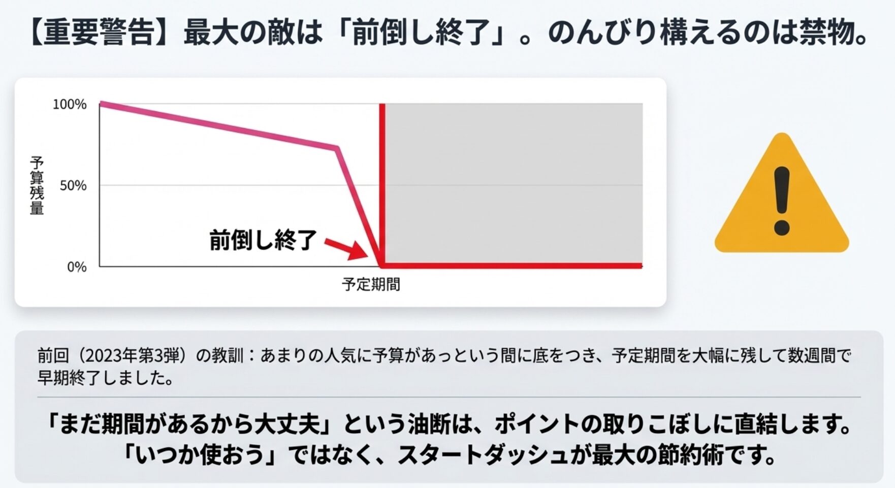 ここが最も重要なポイントです。2023年の第3弾は、当初の予定期間を大幅に残し、予算上限に達したため数週間で「前倒し終了」となりました。