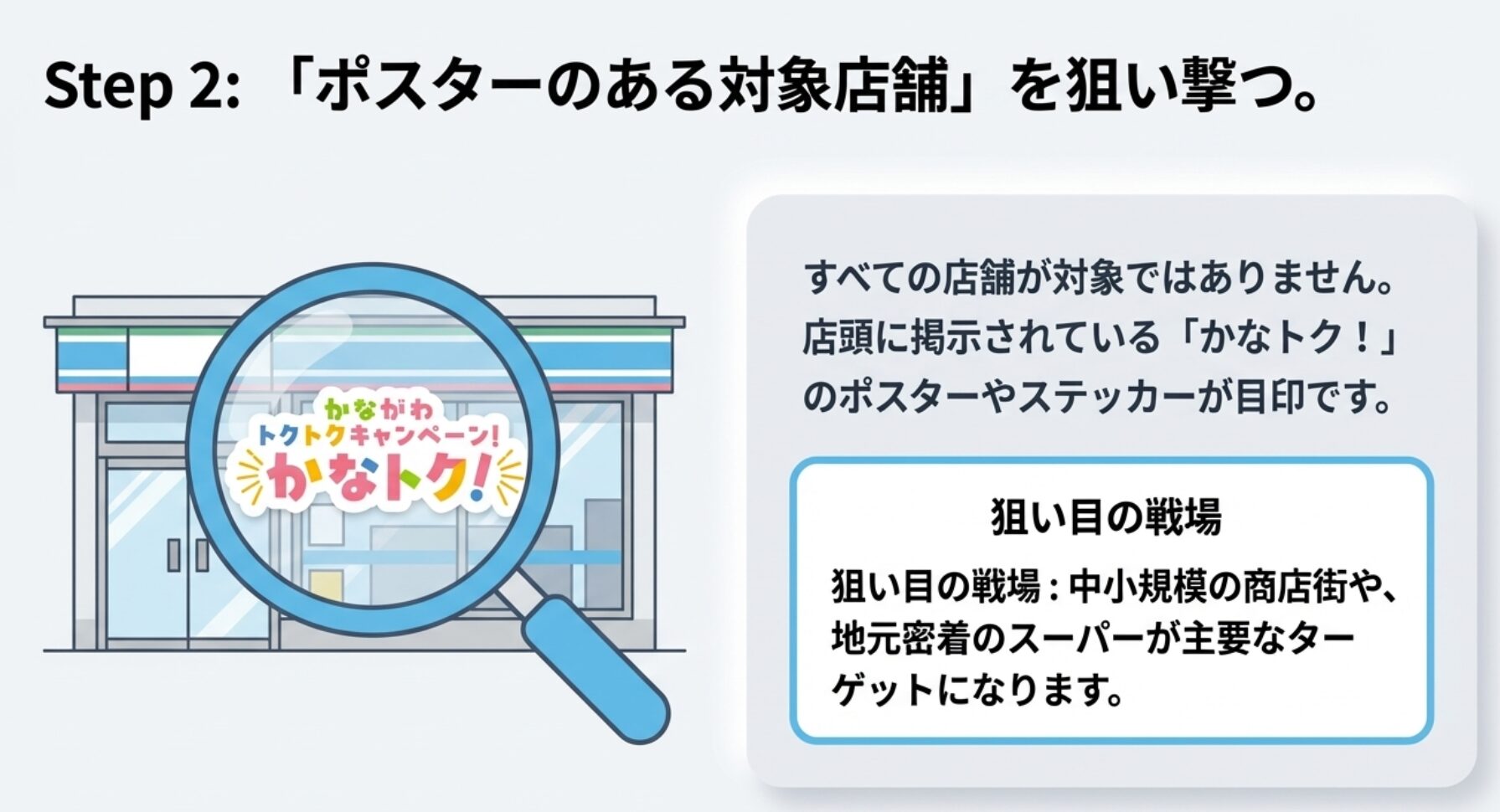 店頭に掲示されている「かなトク!」のポスターやステッカーが目印です。特に、中小規模の商店街や地元密着のスーパーなどが狙い目です。