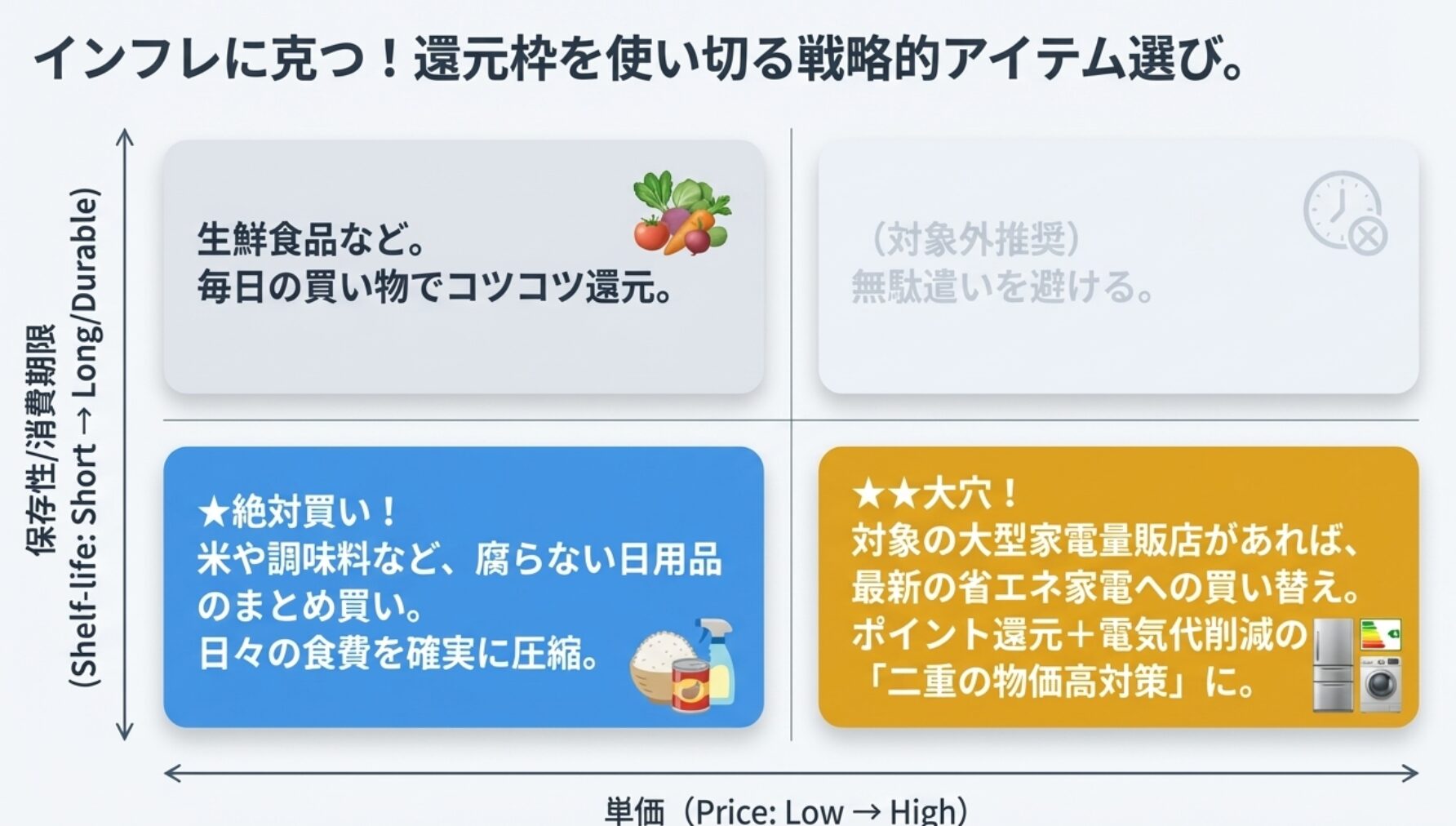 家電量販店(対象の場合): もし大型店舗が対象に含まれれば、最新の省エネ家電への買い替えも検討の価値あり。電気代の削減という、二重の物価高対策になります。