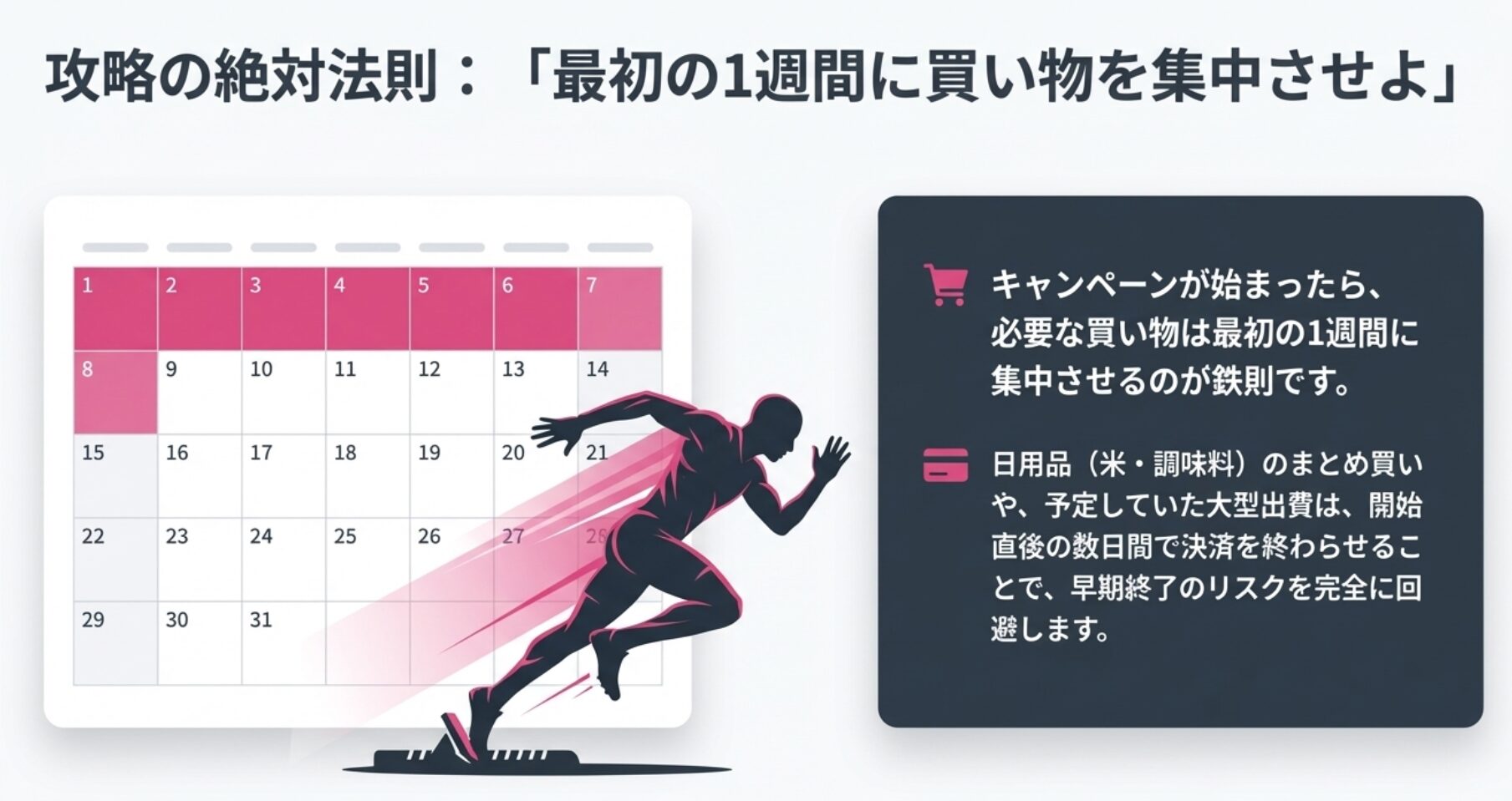 キャンペーンが始まったら、「必要な買い物は最初の1週間に集中させる」のが鉄則です。