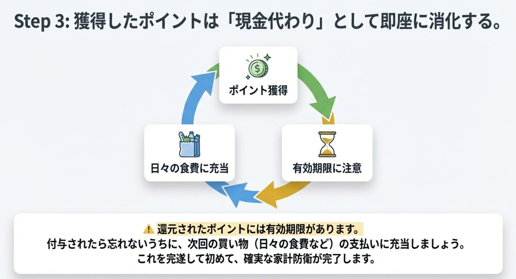 付与されたら忘れないうちに、次回の買い物で「現金代わり」として使い切りましょう。
