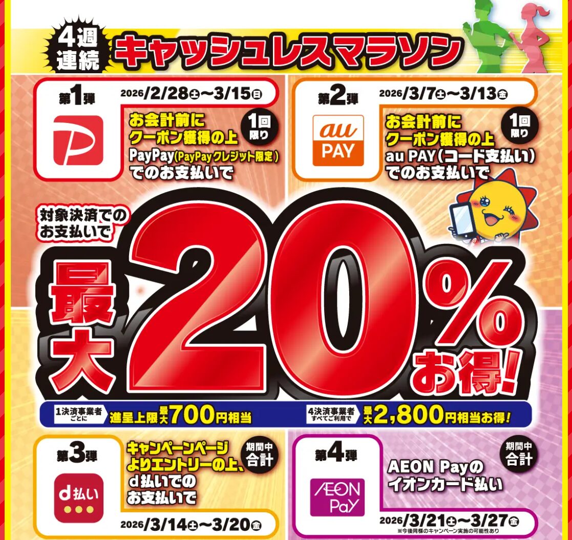 2026年3月のコジマは、まさにキャッシュレス決済の「激アツ」期間です。現在開催中のau PAY(3/13まで)を皮切りに、d払い、AEON Payと続きます。