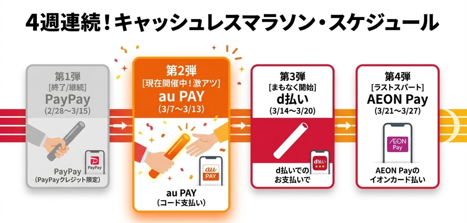 2026年3月は、週替わりで主要なQRコード決済サービスがバトンをつなぐ、まさに「お買い物の祭典」です。