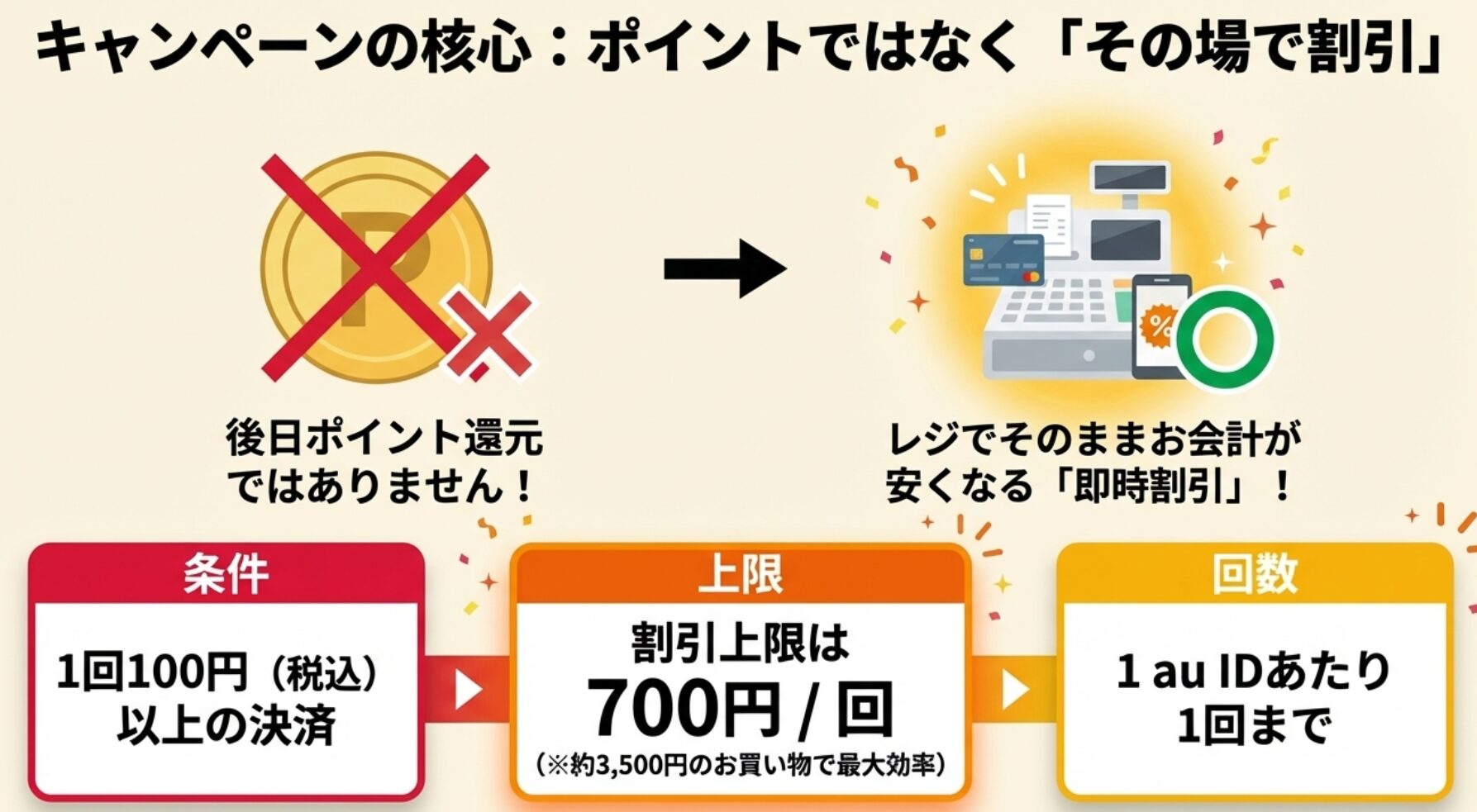 特にau PAYの20%割引(上限700円)は、3,500円程度の買い物をした際に最大の恩恵を受けられます。
