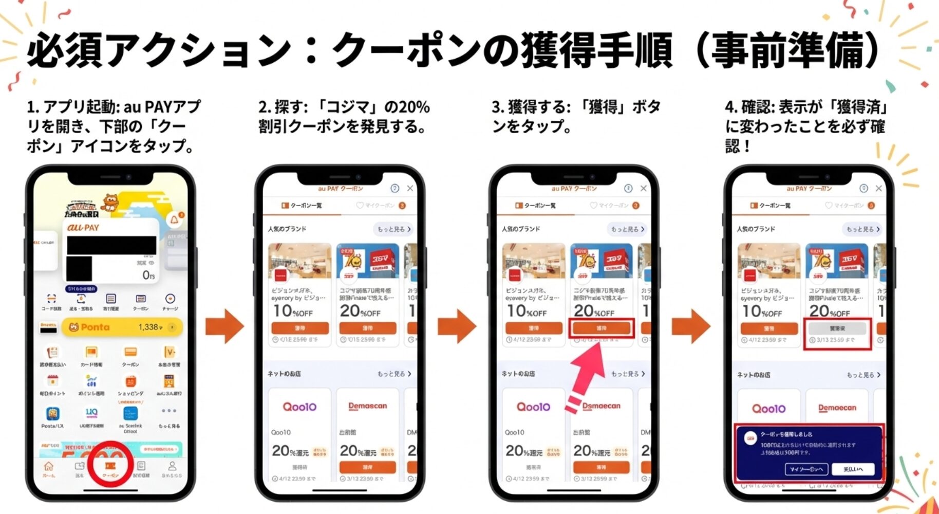 au PAY、コジマの対象店舗で使える最大20%割引クーポンをプレゼント(2026年3月7日~)