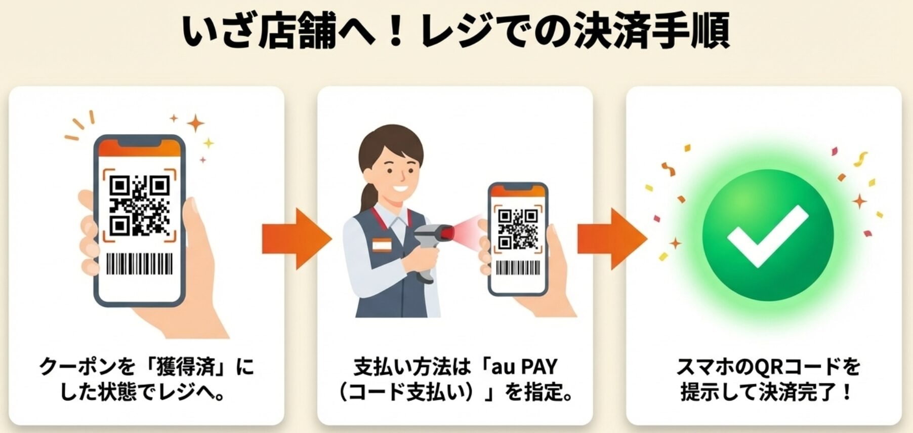 4. 店頭でお支払い: 会計時にau PAY(コード支払い)で決済。クーポンを選択して決済に進めばOK