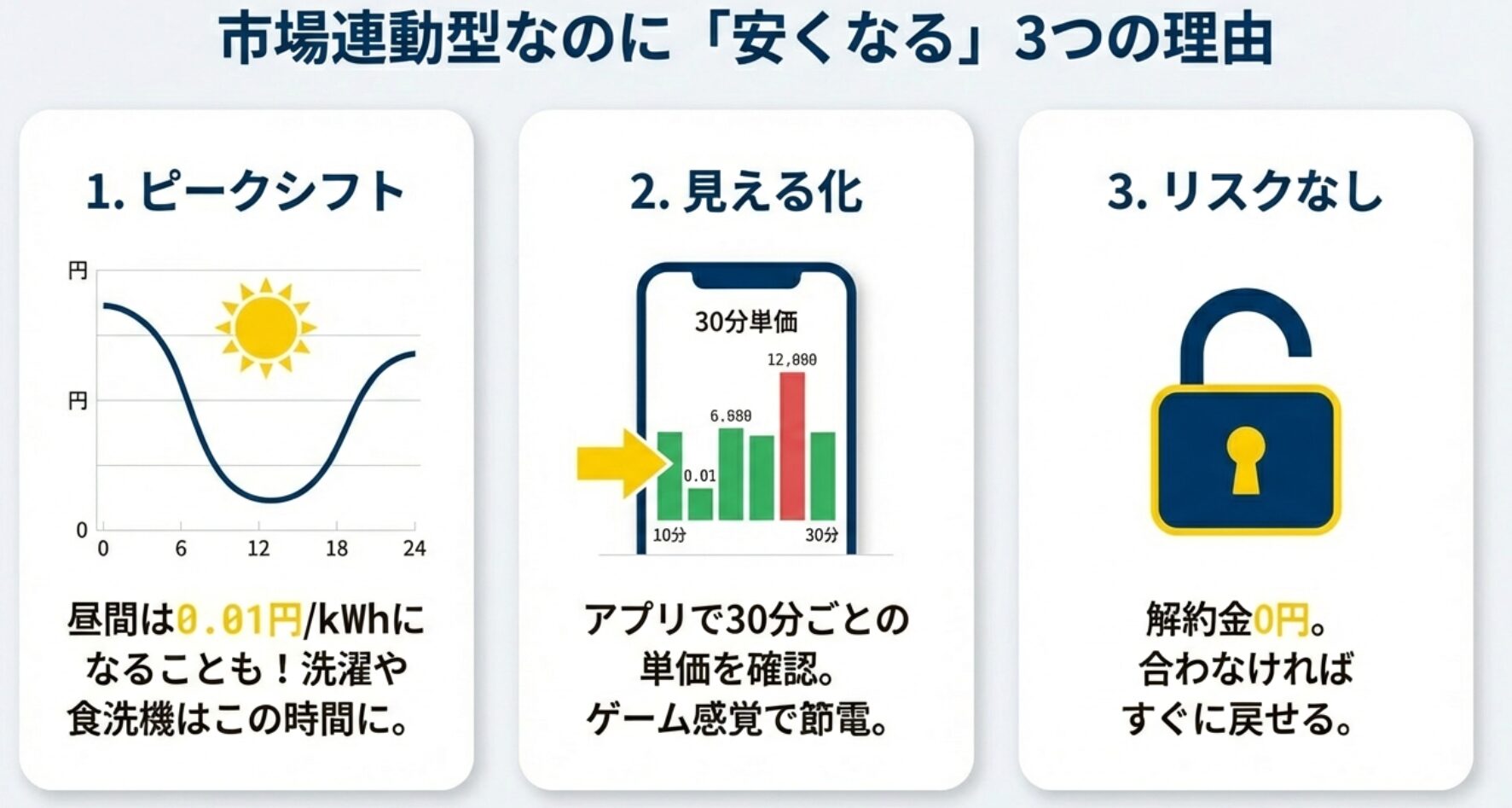 「市場連動型は不安」という声もありますが、実際にはアプリを確認するだけの簡単な習慣で、大手電力会社では不可能な節約額を実現できます。