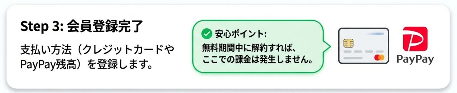 支払い方法(クレジットカードやPayPay残高など)を選択し、登録を完了させます。無料期間中に解約すれば、ここでの支払いは発生しません。