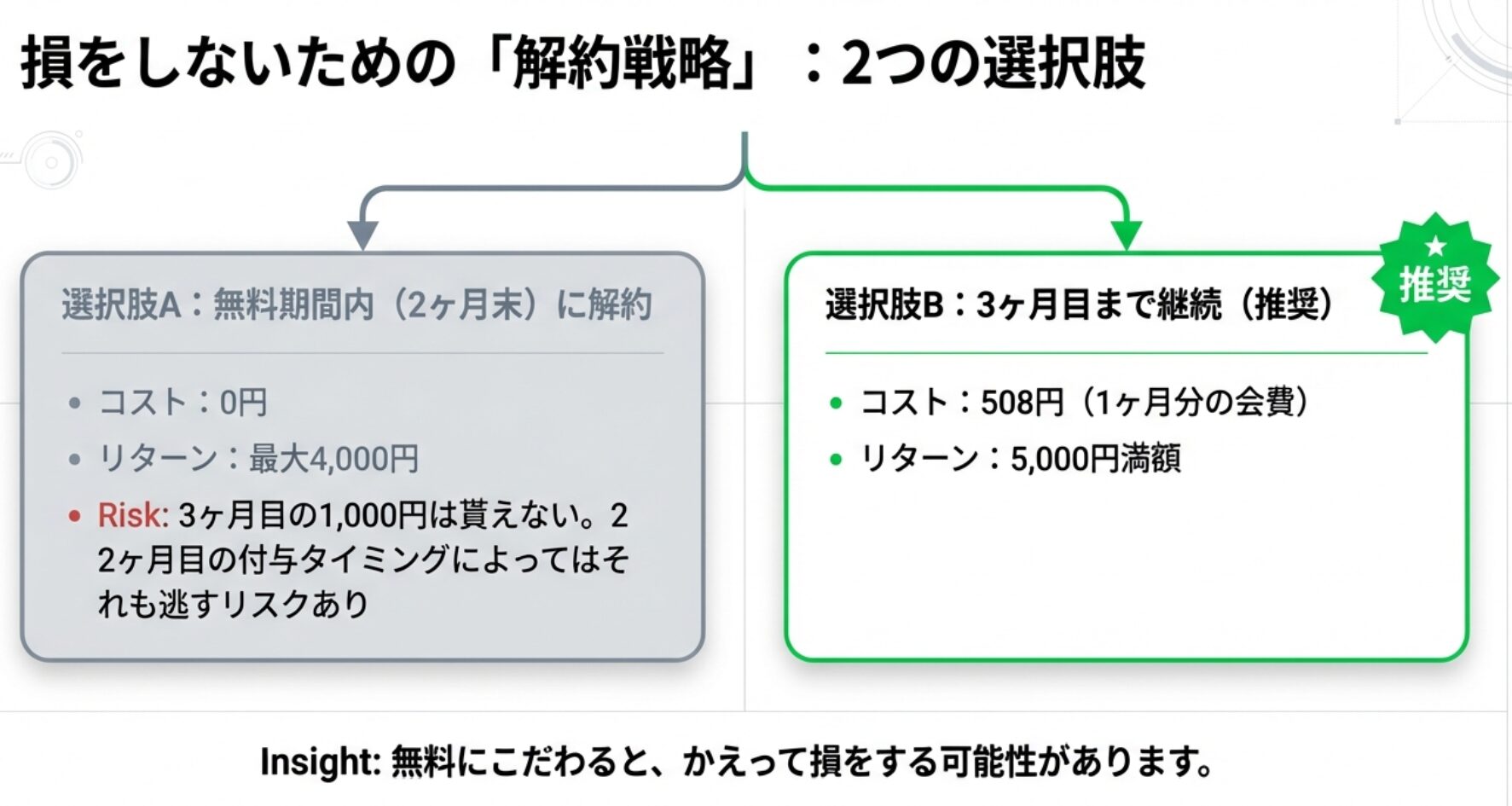 結論: 508円を払ってでも3ヶ月目まで維持し、5,000円を完走したほうが圧倒的にお得です!