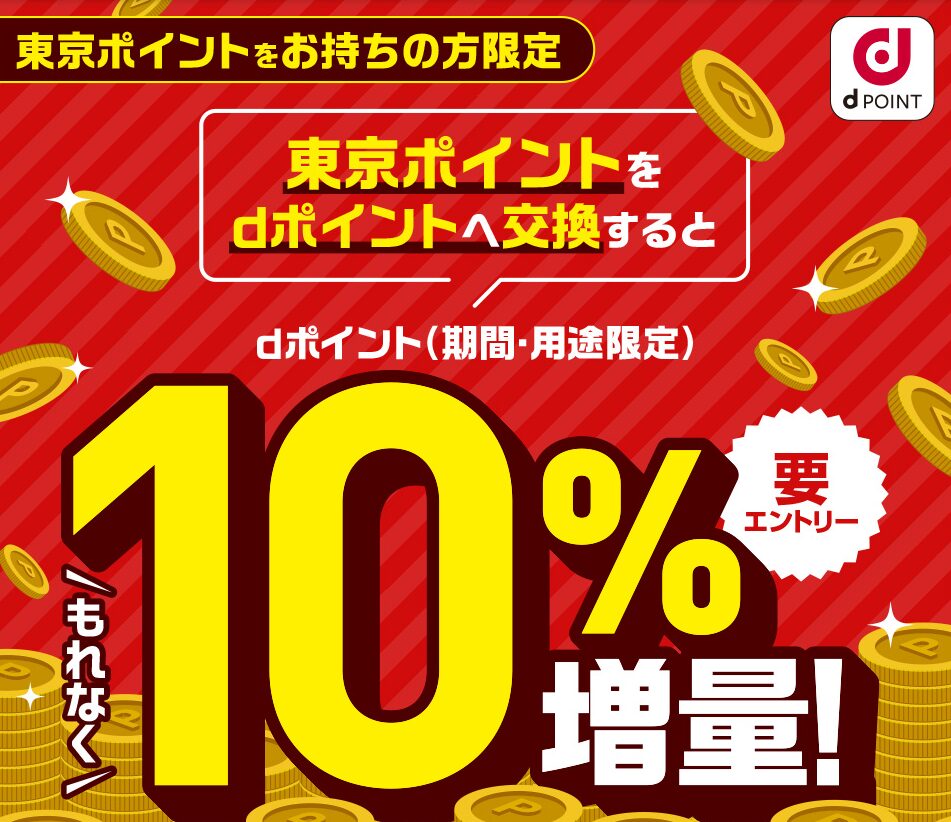 2月2日から開始される東京ポイントをdポイントに交換すると、+10%増量されるキャンペーンを実施中です。