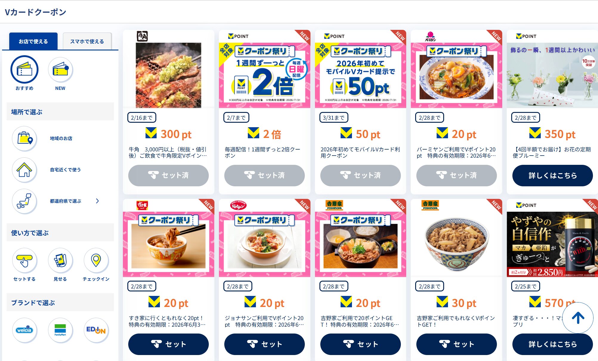 三井住友VISAなどの対象カード限定で「2のつく日はVクーポンDAY!対象クーポンで最大20%還元!」が開催中です。