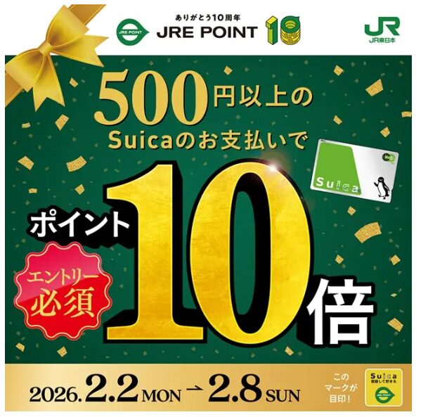 対象期間中にJRE POINT WEBサイトに登録したSuicaを使って、エキナカなどの対象店舗で 1回あたり500円(税込)以上 のお買いものをすると、ポイントが通常の 10倍 貯まるキャンペーンです。