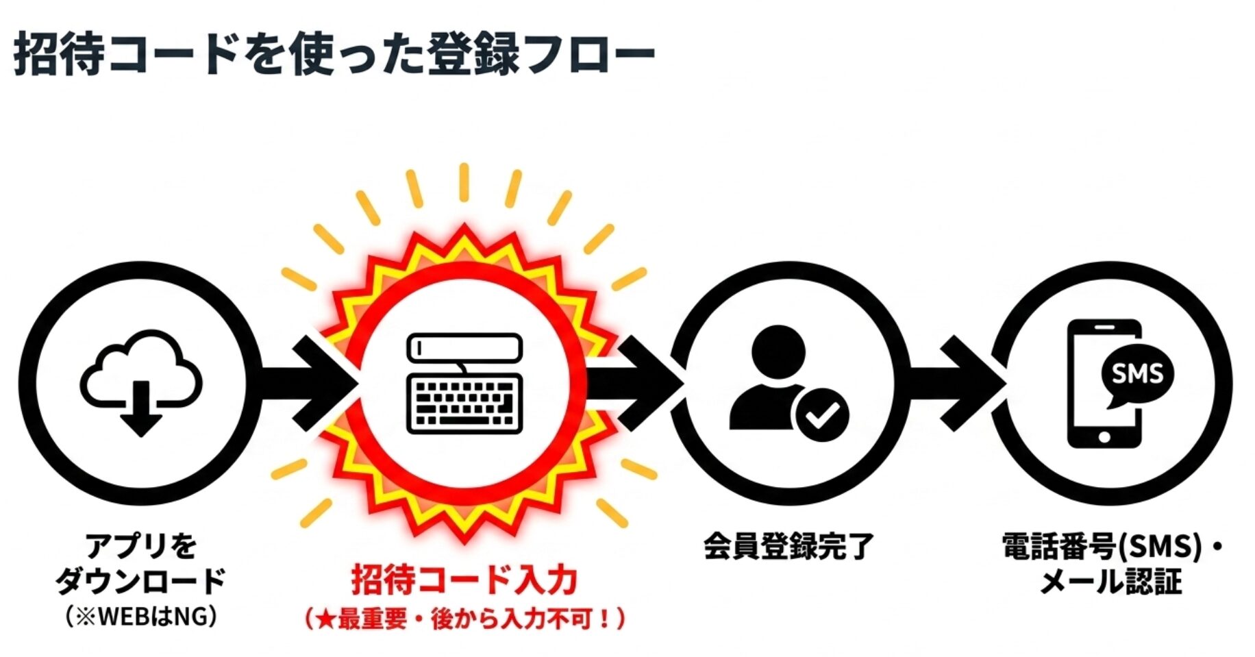招待コードの入力は、WEBサイトからではなく「公式アプリ」からの登録が必須条件です。