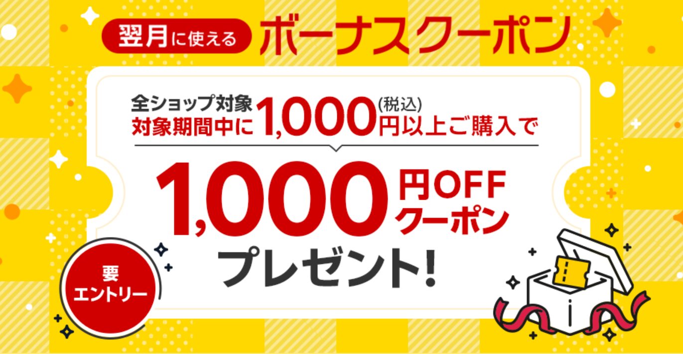 楽天市場「翌月に使える1,000円OFFボーナスクーポンプレゼント」をチェックする