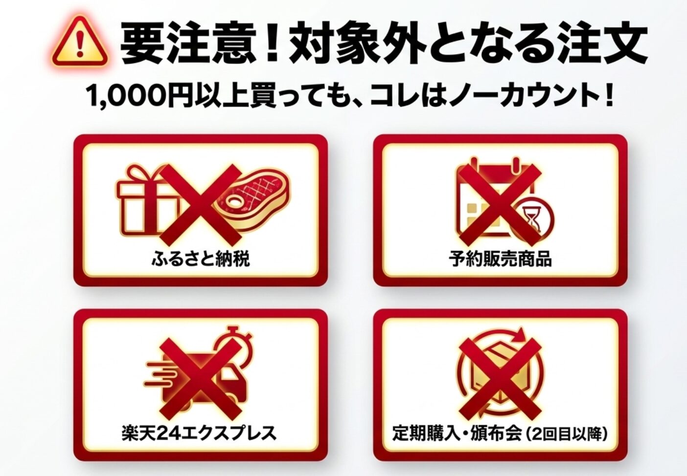 以下のケースは、1,000円の条件を満たしていても対象外となります