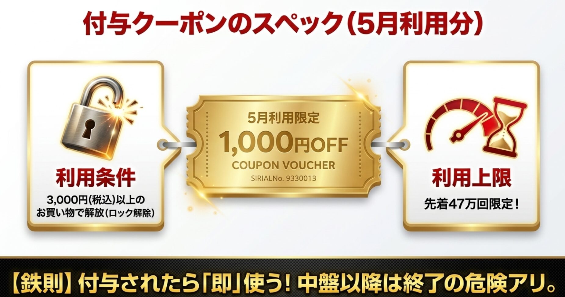 3. 5月8日以降に付与されるクーポンを3,000円以上の買い物で早めに使う