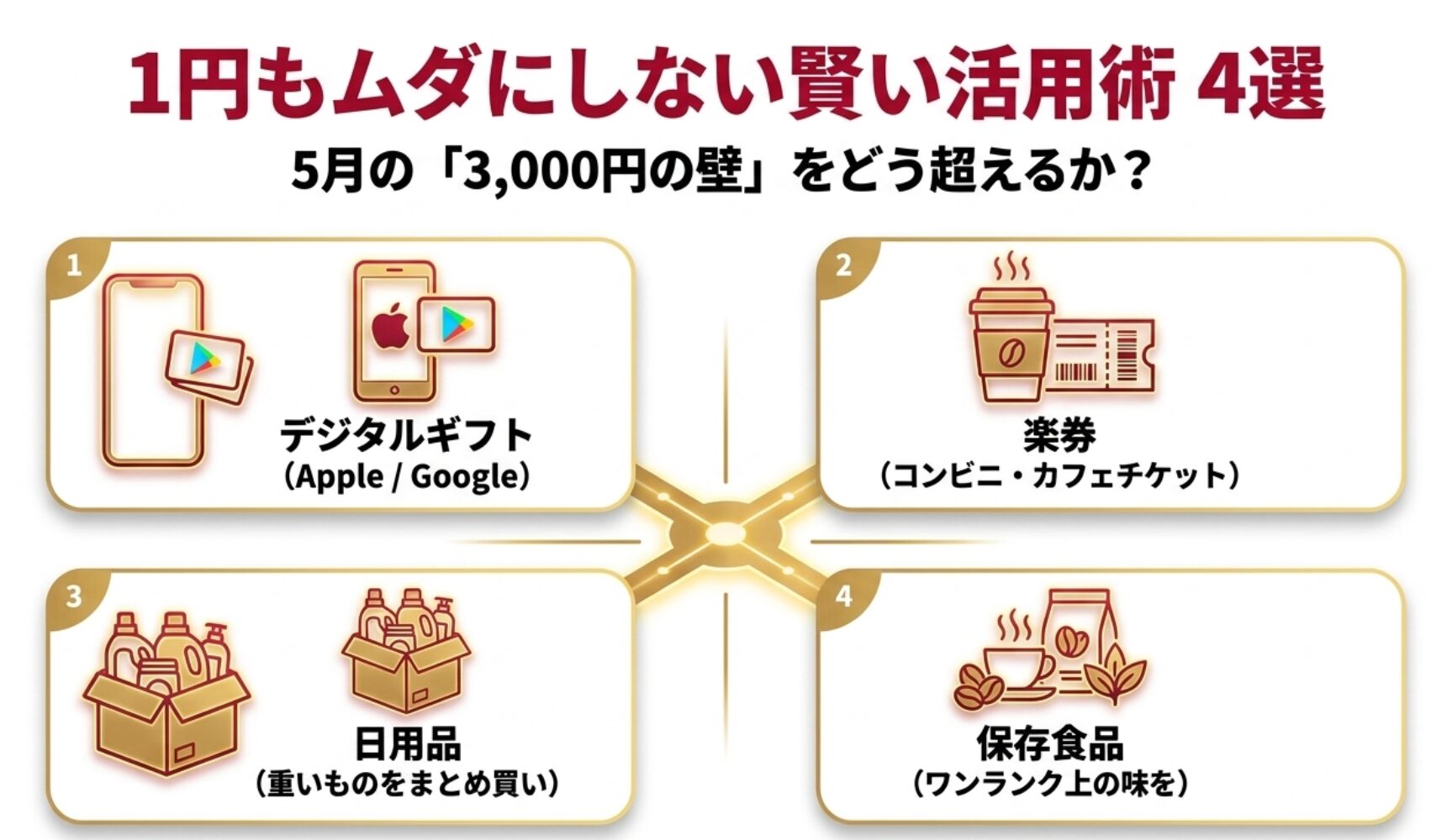コンビニでのちょっとした買い物が常に3割引きになる計算です。サーティワンのギフト券なども人気で、自分へのご褒美を安く済ませる賢いテクニックです。