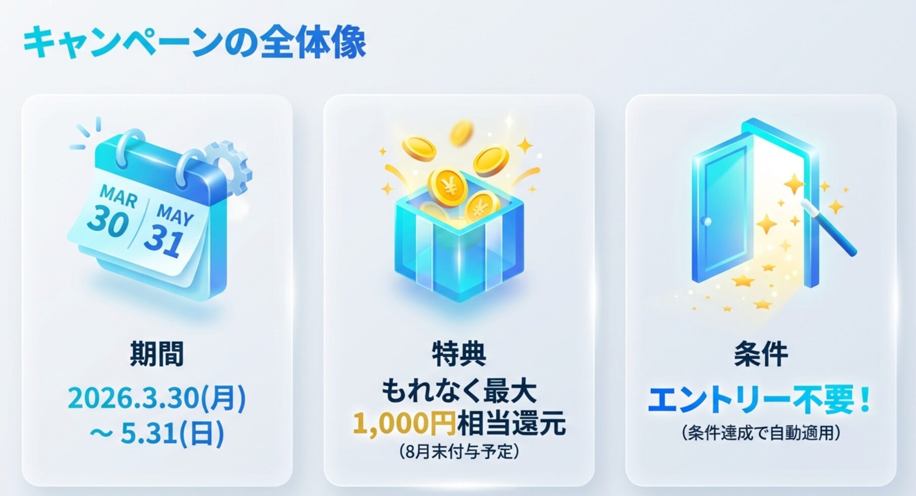 1,000円相当の還元の内訳は通常利用ポイント(0.5%〜1.0%)に加えて、キャンペーン特典ポイントが上乗せされる形になります。