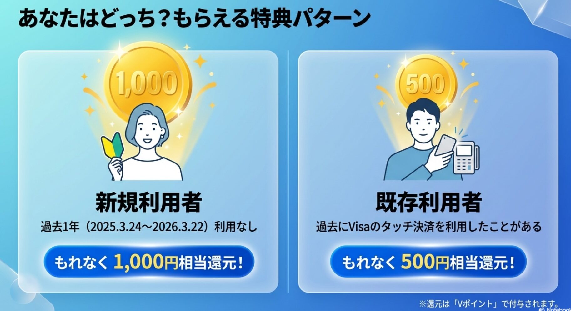 | 新規利用者 | 2025年3月24日~2026年3月22日にSamsung Pay利用なし | もれなく1,000円相当還元 |