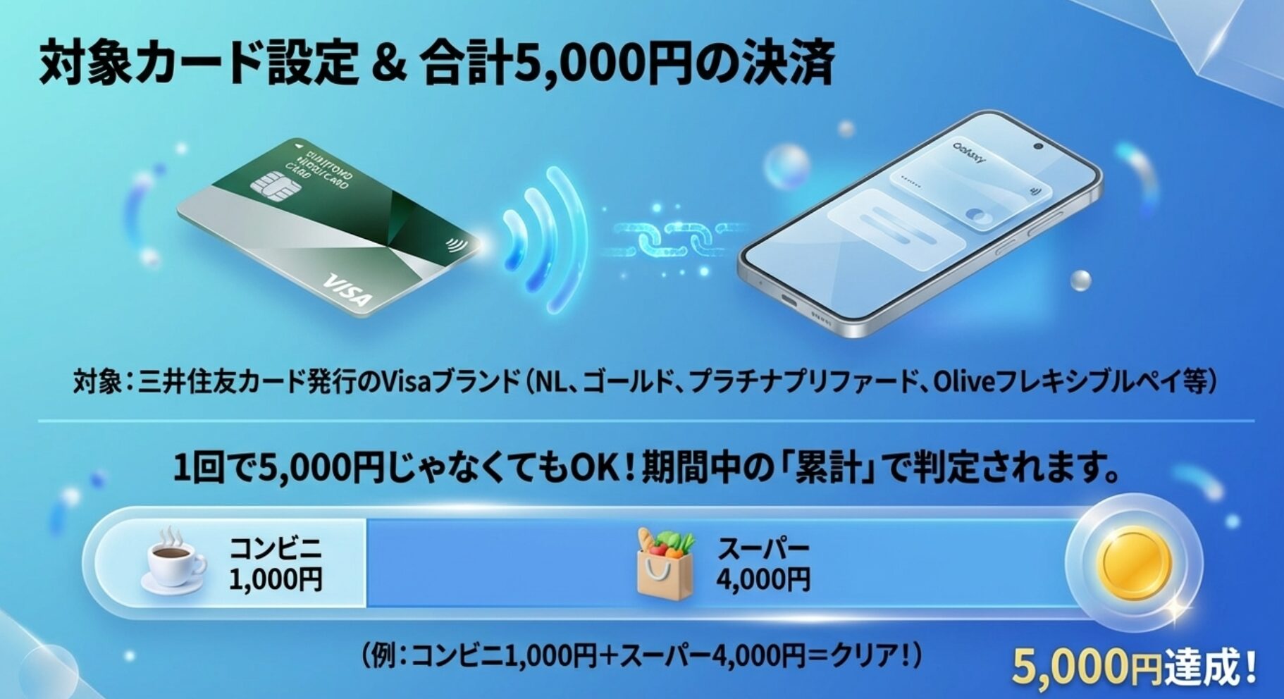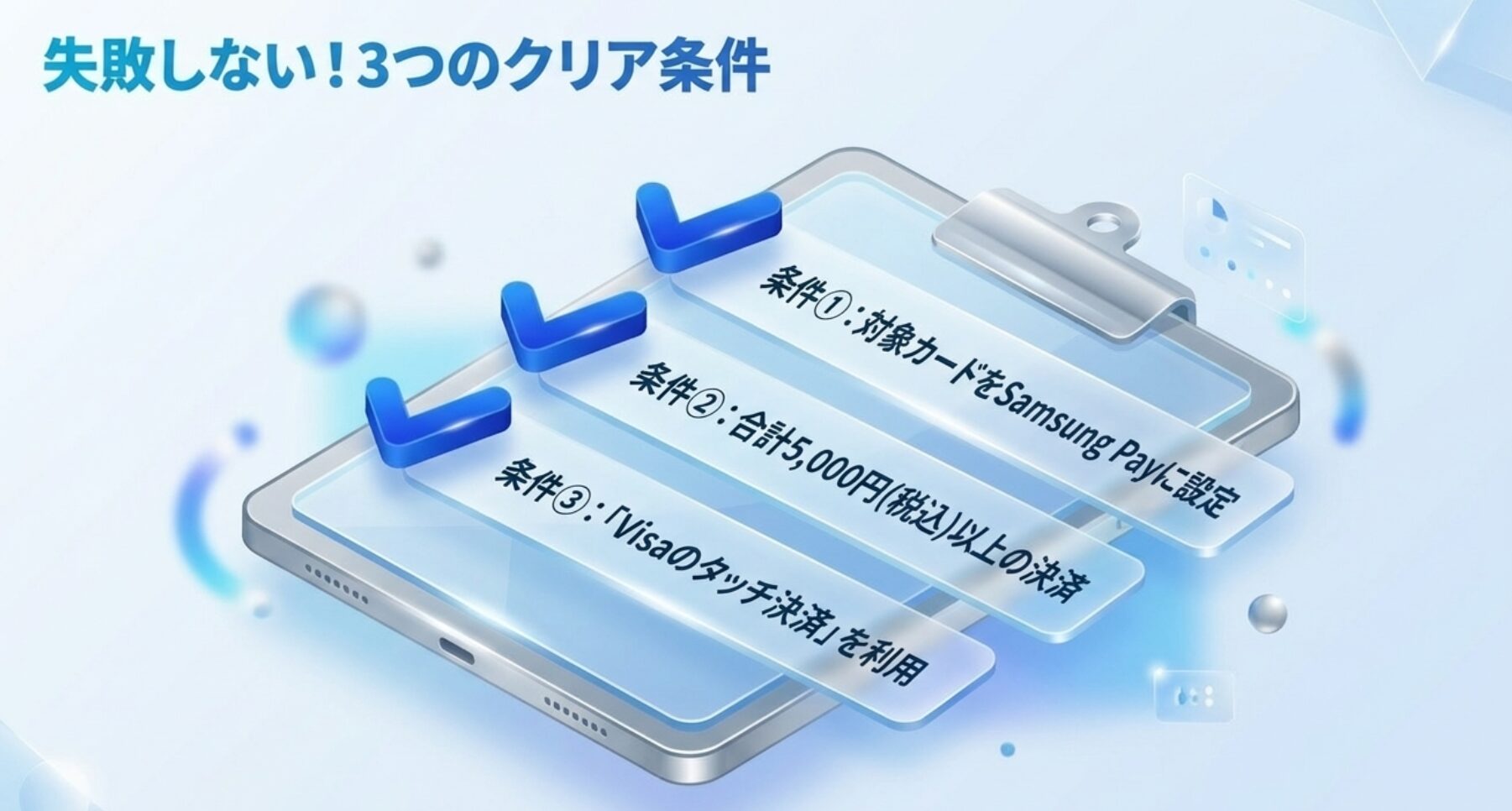 - 条件: 三井住友カードをSamsung Payに設定し、期間中に合計5,000円(税込)以上の「Visaのタッチ決済」を利用。