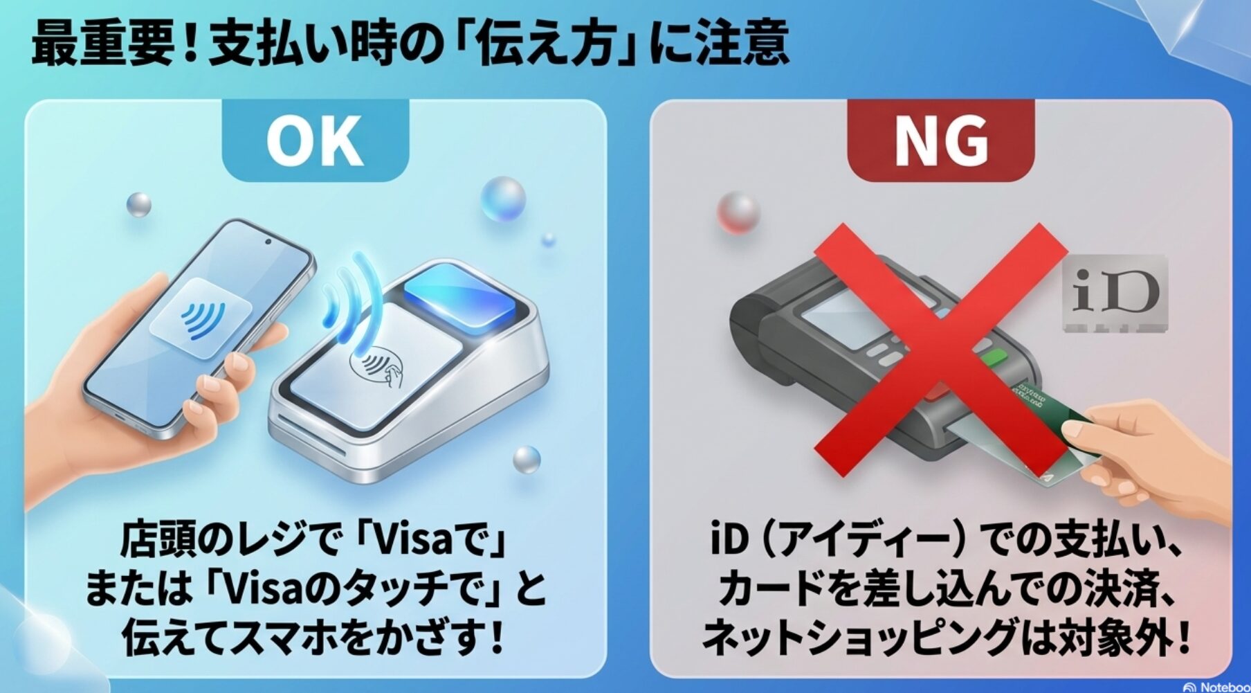 iDでの支払い、カードを差し込んでの支払い、磁気取引などは対象外です。