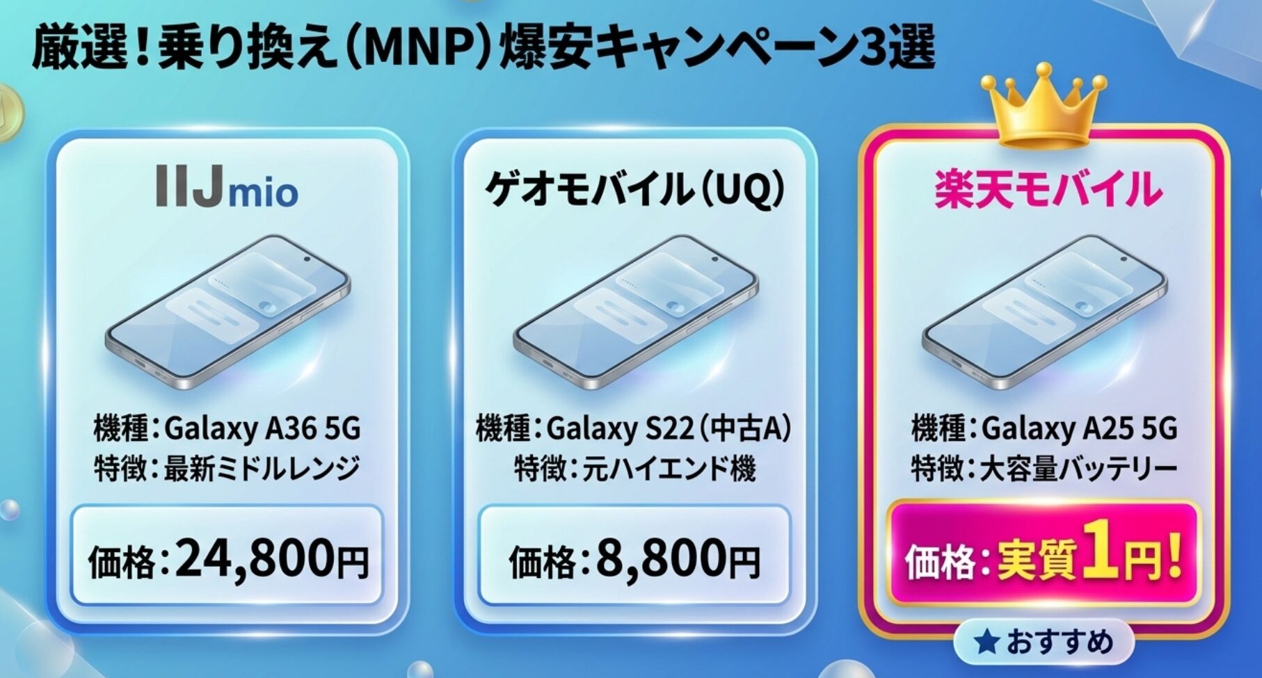 - Galaxy未所有の方: 楽天モバイルやIIJmio、ゲオモバイル等のMNPキャンペーンを活用すれば、1円〜2万円台で端末が手に入ります。