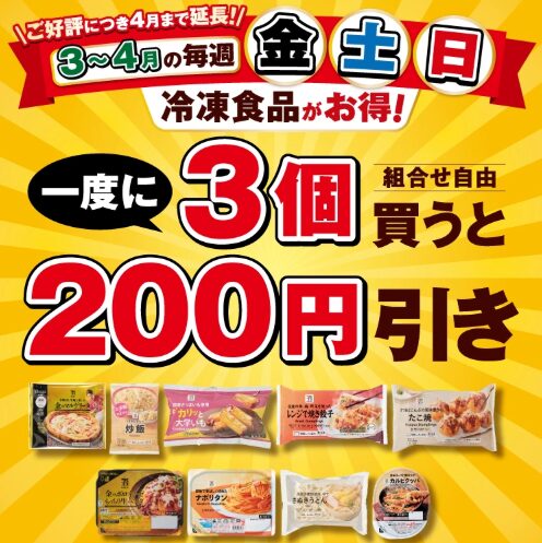 なんと、2026年3月の毎週金・土・日曜日限定で、対象の冷凍食品を一度に3個(組み合わせ自由)購入すると200円引きになるという、驚愕の割引セールが実施されています。