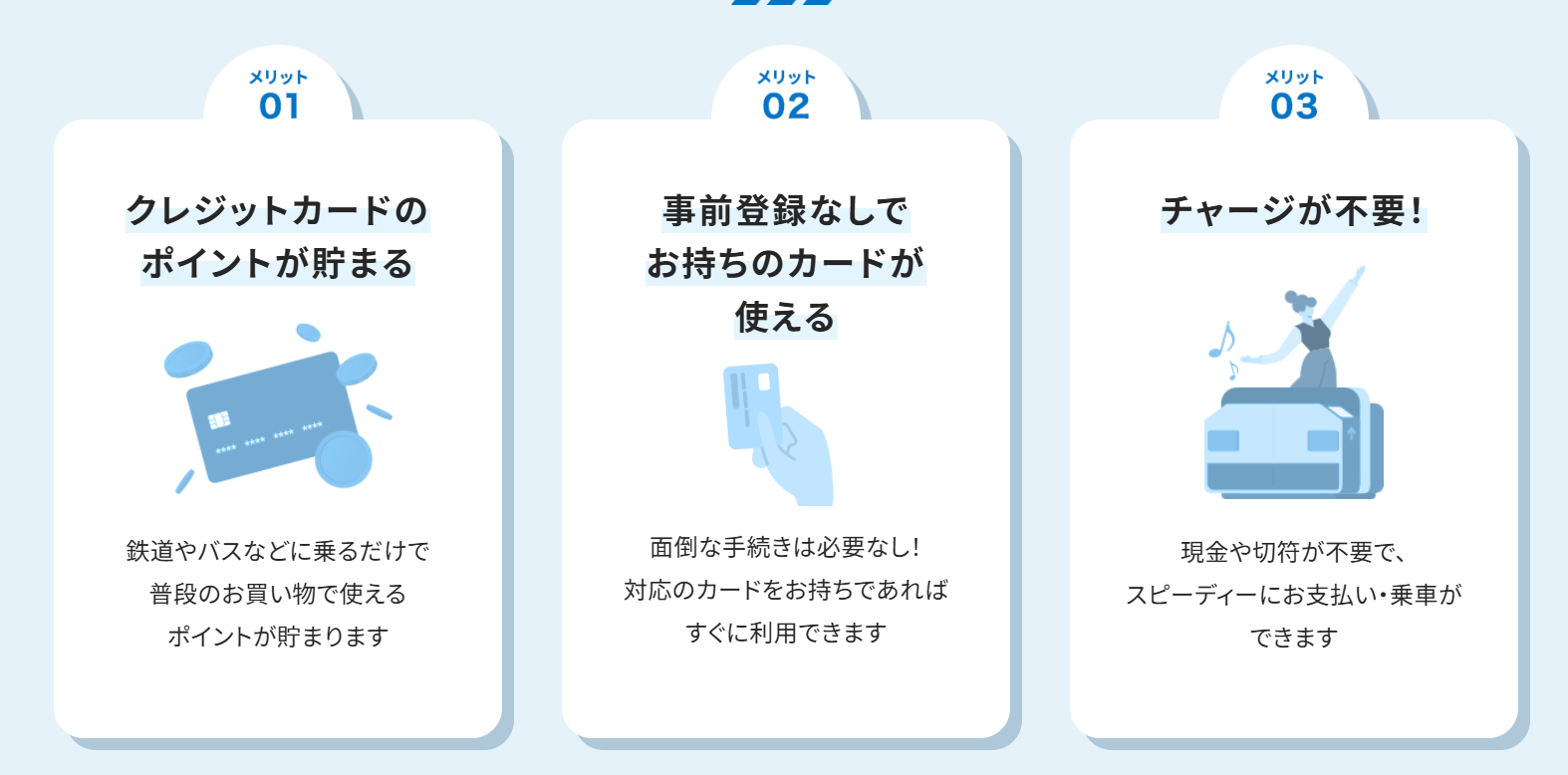 最大のメリットは、交通系ICカードのような事前のチャージが一切不要である点です。後払い方式(ポストペイ)のため、残高不足で改札が閉まるストレスから解放されます 。